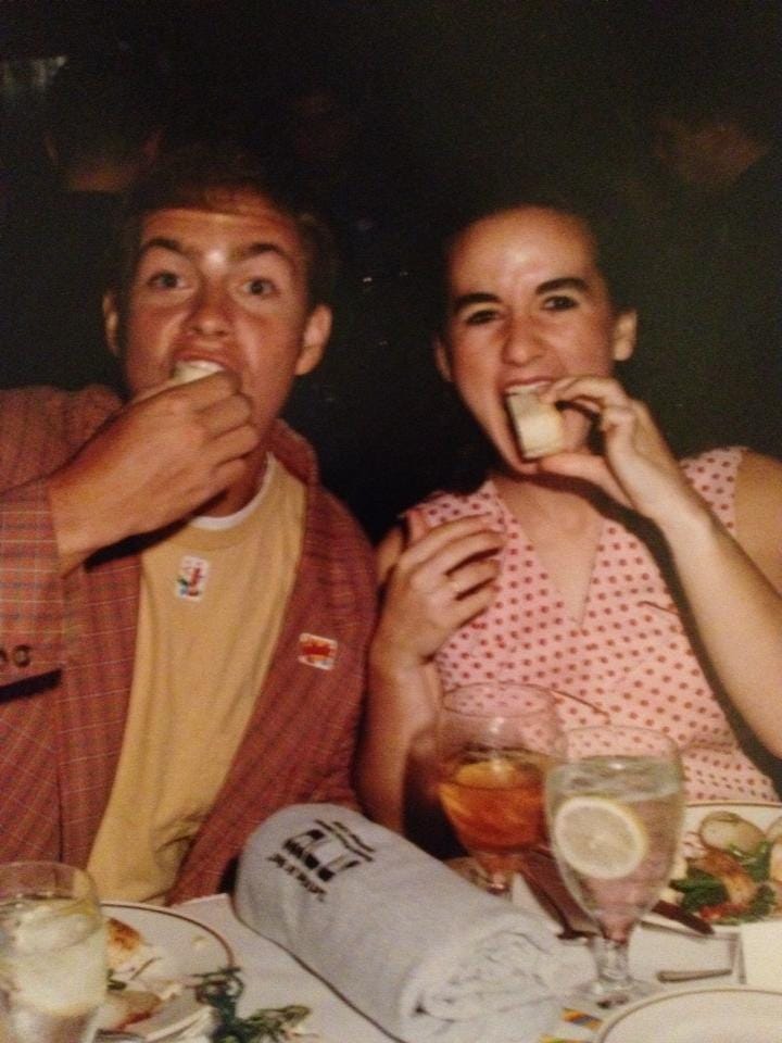 Dr. Evan Lenow sits with his then-girlfriend, now-wife, Melanie Massad, at a 70's-themed party for Shawreth Men’s Club. Lenow is an associate professor in the Department of Christian Studies. (Photo provided by Evan Lenow)