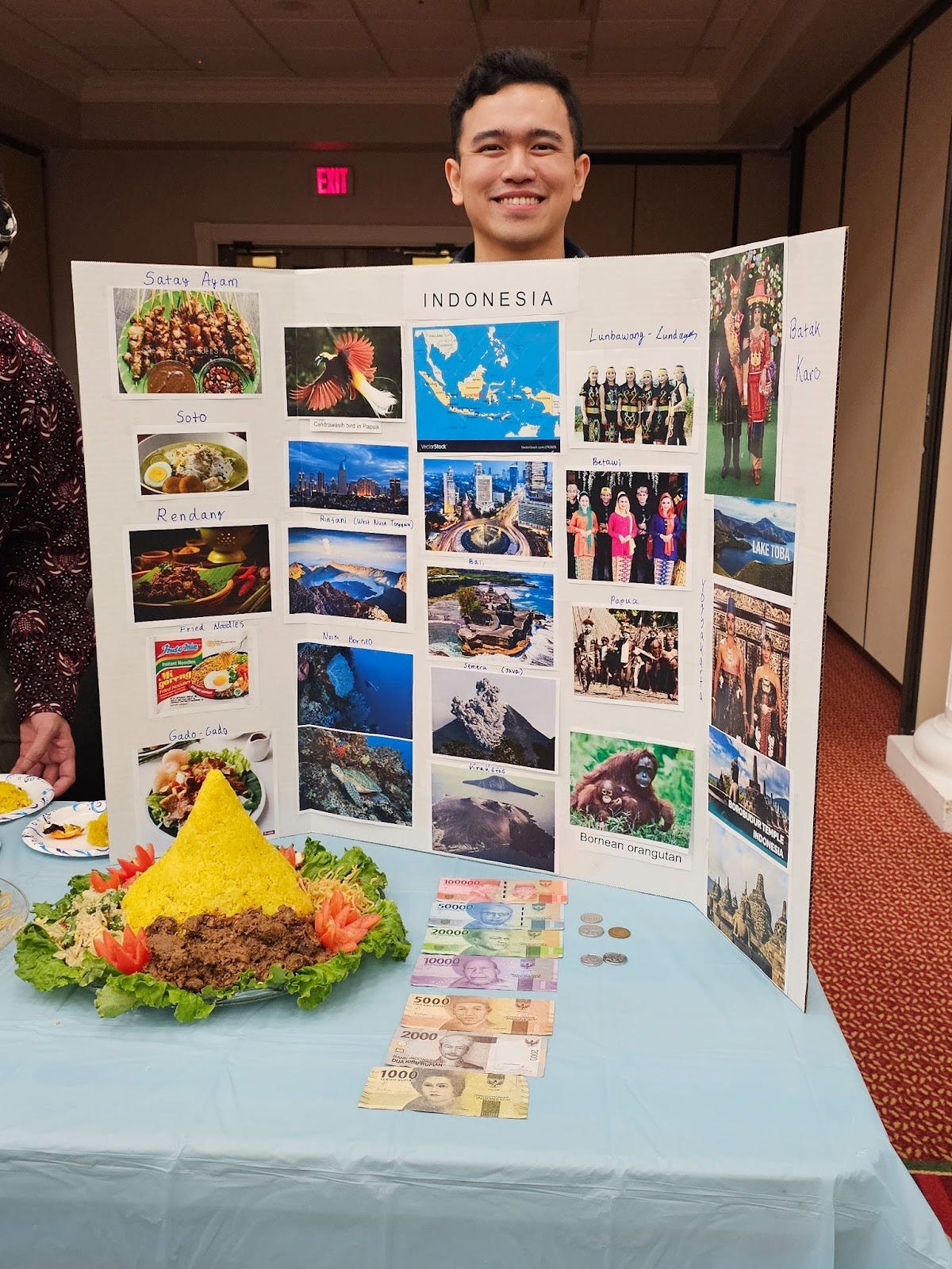 Indonesia served different food with a rice tower, coins, currency, country’s animals, and clothing from their native land.