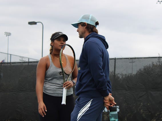 Elyangelica Alas received coaching from Coach Michael Ward during her Friday doubles match against UT Tyler. Alas plays line one doubles for the Choctaws, and, alongside Cota, was ranked 6th in the region during the fall season.