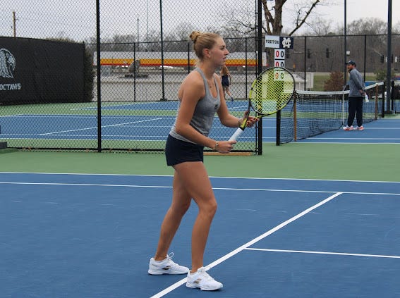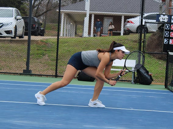 Alas as she begins her service motion during the doubles point. This is Alas’s fifth year playing for Mississippi College. She is playing line one singles and line one doubles for the third year in a row.
