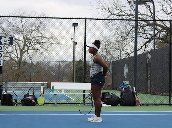 Rodriguez prepares at the net while she waits for Roberts to return. Rodriguez and Roberts have been playing together for three years. This is Rodriguez’s last season. Roberts is a senior with another year of eligibility.