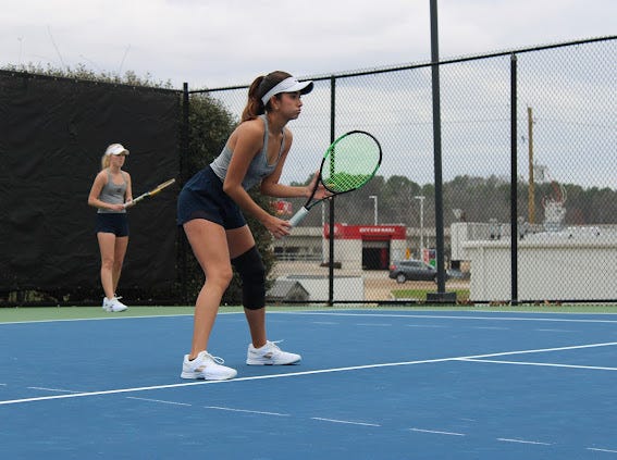 Fernanda Cota waits for her doubles partner to serve during the Choctaw women’s tennis match Friday, Feb. 9, against the University of Texas at Tyler. Because of rain, Mississippi College’s women’s opening weekend was moved to Thursday and Friday. The Choctaws won their first match Thursday 7-0 against Harding University.
