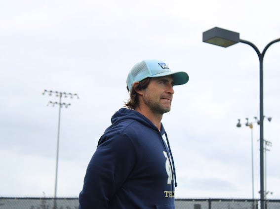 Coach Ward watches Cota and Alas’s performance against UT Tyler. Coach Ward has been emphasizing an aggressive style of doubles play. Cota and Alas won the match 6-4.