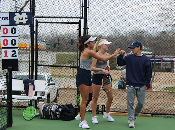 Emma Roberts and Maria Rodriguez on the change-over receive coaching from assistant coach Brady McDaniel. McDaniel is a former Mississippi College tennis player. He graduated in 2023, and he is now serving as an assistant coach.