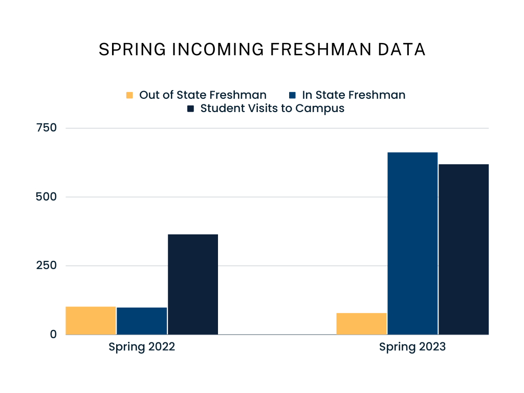 Visits to campus have increased in terms of freshman engagement. Last year, 363 potential students had visited campus by February; this year campus had 618 potential students visit, nearly doubling the number of visits. Both preview days in the fall were the biggest that campus has had since before COVID-19 hit.